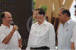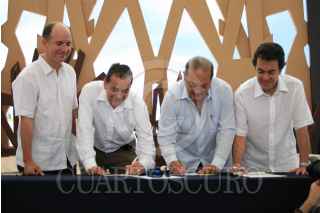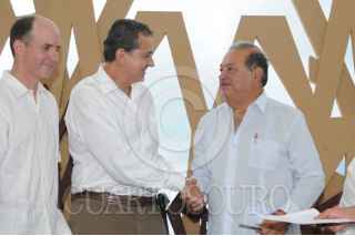 COZUMEL, QUINTANA ROO, 04JUNIO2009.- El secretario del Medio Ambiente, Juan Rafael Elvira Quesada, Carlos Slim, presidente de la fundación Carlos Slim y Omar Vidal, de la World Wildlife Fundation, durante la firma del convenio de colaboración entre (WWF) la Fundación Carlos Slim y el Gobierno Federal, para la conservación de la Biodiversidad y promoción del Desarrollo Sustentable de México. FOTO: XIMENA DE LA SERNA/CUARTOSCURO.COM