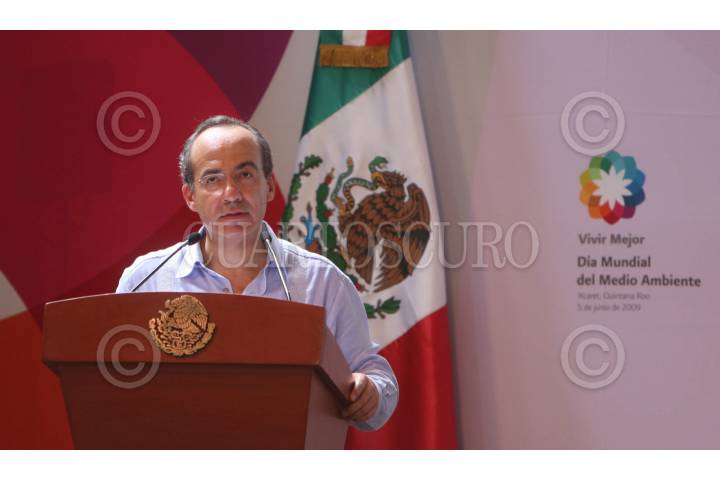 XCARET, QUINTANA ROO, 05JUNIO2009.- Felipe Calderón Hinojosa, presidente de México, realizó la cancelación del timbre postal conmemorativo al día mundial del medio ambiente. Lo acompañan el gobernador de la entidad Felix González y la primera dama, Margarita Zavala. En el evento se entregó reconocimientos al merito ecológico, el cual se le otorgo al cantante Emmanuel. FOTO: ALFREDO GUERRERO/CUARTOSCURO.COM