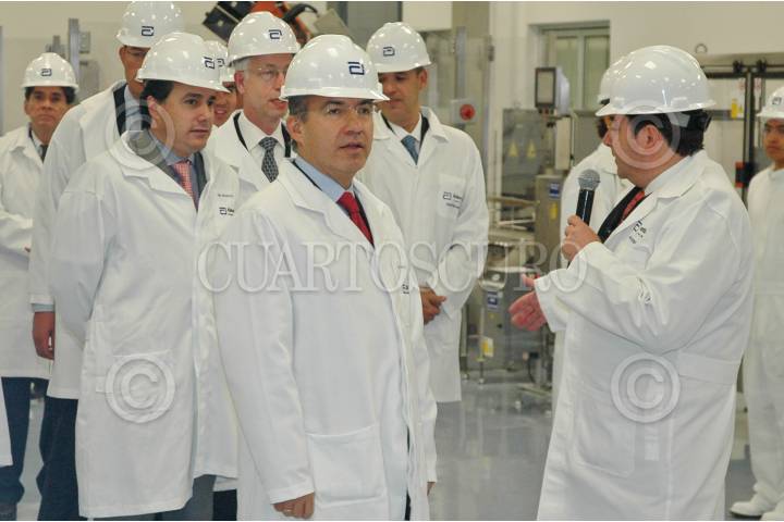 MÉXICO, D.F., 10JUNIO2009.- El presidente Felipe Calderón oprimio el boton de operaciónes durante el recorrido inaugural de la planta Abbott al lado de Holger Liepmann, presidente global de Abbott Nutrición. FOTO: RODOLFO ANGULO/CUARTOSCURO.COM