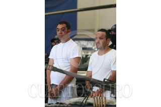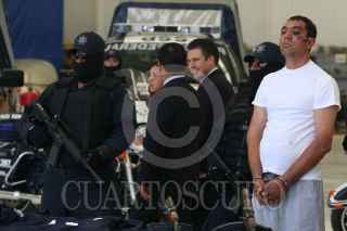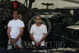 MÉXICO, D.F., 10JUNIO2009.- La Secretaria de Seguridad Pública federal, presentaron ante los medios de comunicación a dos sujetos que fueron detenidos el día de ayer después de un enfrentamiento contra la Policía Federal y el Ejercito Méxicano en el fraccionamiento las Brisas en la ciudad de Durango. Dichos sujetos presuntamente trabajaban para Joaquin Guzmán, alias "El Chapo Guzmán". FOTO: SAÚL LÓPEZ/CUARTOSCURO.COM