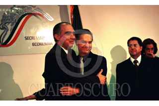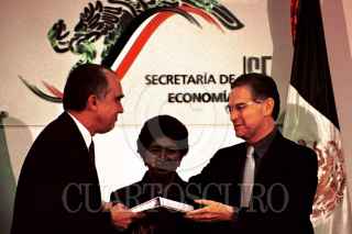 Luis Ernesto Derbez títular de la secretaria de Relaciones Exteriores, da la bienvenida al nuevo secretario de Economía, Fernando Canales Clarión que fungirá a cargo de la secretaria de Economía. FOTO: Eunice Adorno/CUARTOSCURO.COM
