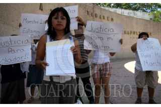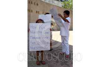 VILLAHERMOSA, TABASCO, 11JUNIO2009.- Niños junto con sus padres, acudieron al monumento a los Niños Héroes para mostrar carteles en apoyo a su maestra Maribel Martínez González, quien fue violada sexualmente por el líder del Sindicato Independiente de Trabajadores de la Educación en Tabasco (SITET); Roger Arias, quien tras golpear a la educadora la introdujo a la fuerza a un motel. FOTO: MARCO POLO GUZMÁN HERNÁNDEZ/CUARTOSCURO.COM