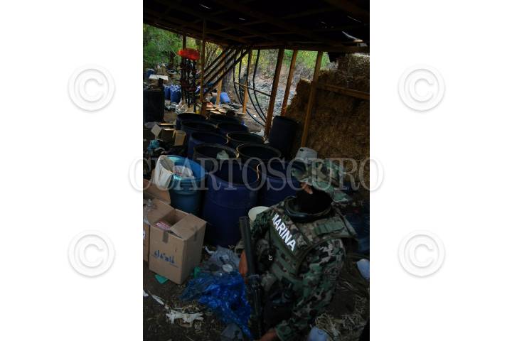 HUAJOTE, SINALOA, 12JUNIO 2009.- Personal de Infantería de Marina, adscrito a la Cuarta Región Naval, con sede en Guaymas, durante un operativo aseguraron una cifra record de cerca de 50 mil litros de efedrina líquida, en un narcolaboratorio descubierto el día de ayer aproximadamente a 46 kilómetros al norte de Culiacán, dicha sustancia encontrada servía para la elaboración de la droga sintética conocida como “cristal”, a base de efedrina líquida, aunado a lo anterior, encontró en el sitio 4 mil 400 litros de gasolina, 3 mil 250 kilogramos de yodo granulado, mil 850 litros de ácido hipofosfórico y un depósito para agua con capacidad de entre 20 a 25 mil litros. FOTO: GUILLERMO PEREA/CUARTOSCURO.COM