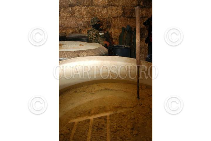 HUAJOTE, SINALOA, 12JUNIO 2009.- Personal de Infantería de Marina, adscrito a la Cuarta Región Naval, con sede en Guaymas, durante un operativo aseguraron una cifra record de cerca de 50 mil litros de efedrina líquida, en un narcolaboratorio descubierto el día de ayer aproximadamente a 46 kilómetros al norte de Culiacán, dicha sustancia encontrada servía para la elaboración de la droga sintética conocida como “cristal”, a base de efedrina líquida, aunado a lo anterior, encontró en el sitio 4 mil 400 litros de gasolina, 3 mil 250 kilogramos de yodo granulado, mil 850 litros de ácido hipofosfórico y un depósito para agua con capacidad de entre 20 a 25 mil litros. FOTO: GUILLERMO PEREA/CUARTOSCURO.COM