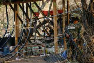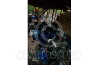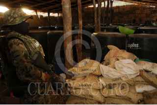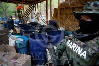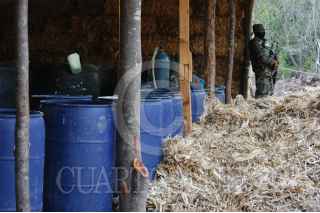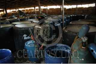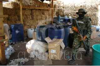 HUAJOTE, SINALOA, 12JUNIO 2009.- Personal de Infantería de Marina, adscrito a la Cuarta Región Naval, con sede en Guaymas, durante un operativo aseguraron una cifra record de cerca de 50 mil litros de efedrina líquida, en un narcolaboratorio descubierto el día de ayer aproximadamente a 46 kilómetros al norte de Culiacán, dicha sustancia encontrada servía para la elaboración de la droga sintética conocida como “cristal”, a base de efedrina líquida, aunado a lo anterior, encontró en el sitio 4 mil 400 litros de gasolina, 3 mil 250 kilogramos de yodo granulado, mil 850 litros de ácido hipofosfórico y un depósito para agua con capacidad de entre 20 a 25 mil litros. FOTO: GUILLERMO PEREA/CUARTOSCURO.COM