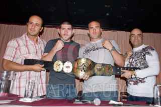 MÉXICO, D.F., 22JUNIO2009.- Los luchadores Tonathiu Arriaga, Diego Garijo,Jasson Lamberert, y Alberto Castillo, durante la presentacion de la función "TOTAL COMBAT" que se realizara en la arena México el próximo 11 de julio, esta función de lucha comúnmente valetodo, contara con estrellas de la liga UFC de Estados unidos prometiendo tener el nivel de las funciones presentadas en las Vegas aseguro el promotor Alberto Castillo. FOTO: RICARDO CASTELAN/CUARTOSCURO.COM