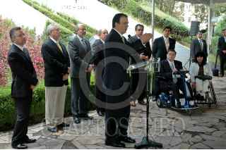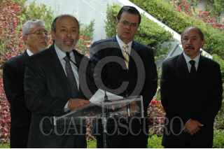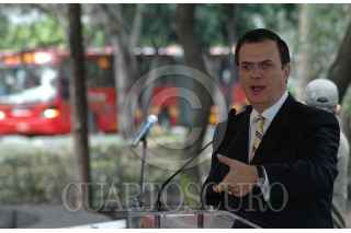 MÉXICO, D.F., 23JUNIO2009.- El jefe de gobierno Marcelo Ebrard durante su participación en la ceremonia del 4° Aniversario de Metrobus que se realizo en el Parque Hundido, en donde estuvieron presentes Jorge Arganiz, secretario de obras; Guillermo Calderon, director del Metrobus; Armando Quintero, secretario de vialidad y transporte. FOTO: RODOLFO ANGULO/CUARTOSCURO.COM