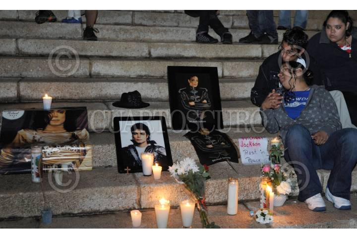 MÉXICO, D.F., 26JUNIO2009.- Un grupo de seguidores del rey del pop se reunieron esta madrugada en las escalinatas de El Angel de la Independencia en donde colocaron fotos, veladores y flores en memoria de su idolo Michael Jackson que fallecio el día de ayer en la ciudad de Los Angeles, California. FOTO: LUIS CARBAYO/CUARTOSCURO.COM