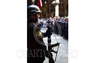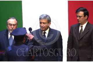 El jefe de Gobierno del D. F., Andrés Manuél López Obrador, entregó reconocimientos a policias destacados del mes, en el Antiguo Palacio del Ayuntamiento. En la gráfica, es acompañado por Marcelo Ebrard y Bernardo Bátiz, secretario de Seguridad Pública y procurador capitalinos. FOTO: Juan Pablo Zamora/CUARTOSCURO.COM