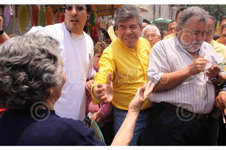 MÉXICO D.F., 27 JUNIO2009.- Raúl Flores, candidato a jefe delegacional de Coyoacán y Alejandro Encinas, candidato a diputado federal, al iniciar un evento proselitista en la explanada del Jardín Hidalgo en el centro de dicha delegación. FOTO: MOISÉS PABLO/CUARTOSCURO.COM