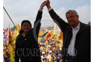 ECATEPEC, EDO. DE MÉXICO, 01JULIO2009.- Andrés Manuel López Obrador y Maribel Alva Olvera, candidata de la coalición de los Partidos de la Revolución Democrática y del Trabajo (PRD-PT) a la presidencia municipal de Ecatepec. López Obrador hizo un llamado cientos de simpatizantes perredistas, que se concentraron en el Faro del Viento, centro cultural de la zona oriente construido en esta administración municipal. FOTO: MARIO NULO/CUARTOSCURO.COM