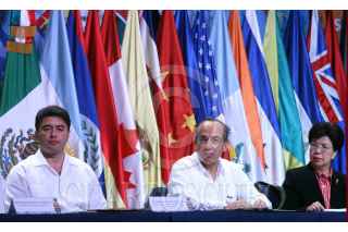 BENITO JUAREZ, QUINTANA ROO., 02JULIO2009.- Felix Arturo González Canto, Gobernador del estado, Felipe Calderón Hinojosa, presidente de México y Margaret Chan, directora general de la Organización Mundial de la Salud, durante la inauguración de la reunión de alto nivel: "Lecciones Aprendidas de la Influenza A-H1N1, que tuvo lugar en este municipio. FOTO: ALFREDO GUERRERO/CUARTOSCURO.COM