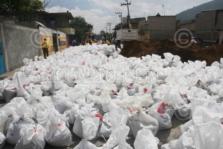 VALLE DE CHALCO, ESTADO DE MÉXICO 03JULIO2009.- Centenares de vecinos, policías estatales, municipales, personal de protección civil y del ejercito mexicano, acudieron a colocar costales de arena al canal de la compañía, debido a que las constantes lluvias han agrietado dicho canal de aguas negras que se encuentran a su máxima capacidad. FOTO: SAÚL LÓPEZ/CUARTOSCURO.COM