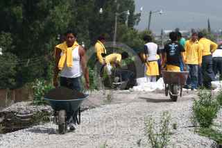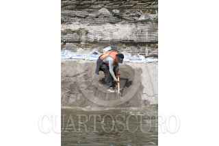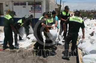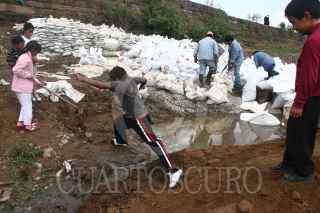 VALLE DE CHALCO, ESTADO DE MÉXICO 03JULIO2009.- Centenares de vecinos, policías estatales, municipales, personal de protección civil y del ejercito mexicano, acudieron a colocar costales de arena al canal de la compañía, debido a que las constantes lluvias han agrietado dicho canal de aguas negras que se encuentran a su máxima capacidad. FOTO: SAÚL LÓPEZ/CUARTOSCURO.COM