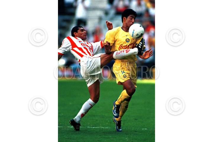 Aguilas del América derrotó 2-0 a Rayos de Necaxa, en partido jugado en el Estadio Azteca, por la fecha cinco del Campeonato Clausura 2003 del futbol mexicano. Tras esta victoria, América llegó a siete unidades dentro del Grupo Uno, mientras Necaxa se quedó con nueve en el Tres, ligando su segunda derrota. FOTO: Pedro Mera/CUARTOSCURO.COM