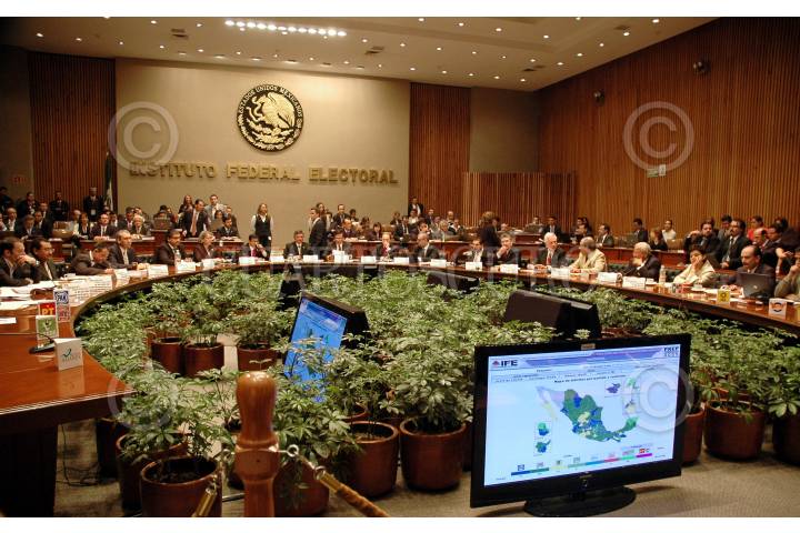 MÉXICO D.F., 05JULIO2009.- El consejero presidente Leonardo Valdéz Zurida saluda al secretario ejecutivo Edmundo Jacobo molina al termino de la reanudación de la sesión permanente que se realizo esta noche en el salón de plenos del Instituto Federal Electoral (IFE) en este día de jornada electoral que se celebro en todo el país. FOTO: RODOLFO ANGULO/CUARTOSCURO.COM