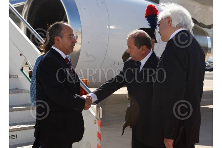 L´AQUILA, LOS ABRUZOS, ITALIA, 08JULIO2009.- Felipe Calderón Hinojosa, presidente de México, durante una reunión que sostuvo con Jacob Zuma, presidente de la República de Sudafrica, esto en el marco de la reunión bilateral del G-5 y que tuvo lugar en la escuela de Suboficiales de la Guardia de Finanzas. FOTO: ALFREDO GUERRERO/CUARTOSCURO.COM