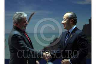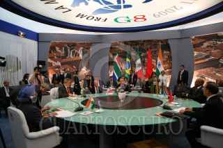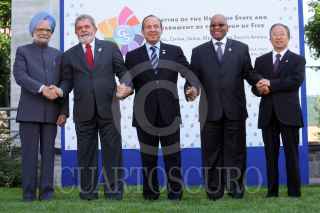 L´AQUILA, LOS ABRUZOS, ITALIA, 08JULIO2009.- Manmohan Singh, primer Ministro de la India, Luiz Inácio Lula Da Silva, presidente de Brasil, Felipe Calderón Hinojosa, presidente de México, Jacob Zuma, presidente de la República de Sudafrica y Wen Jiabao, primer Ministro de China, durante la reunión del G-5 y que tuvo lugar en la escuela de Suboficiales de la Guardia de Finanzas. FOTO: ALFREDO GUERRERO/CUARTOSCURO.COM