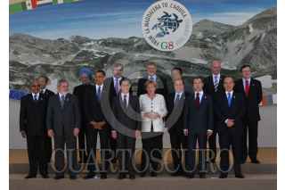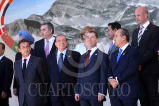 L´AQUILA, LOS ABRUZOS, ITALIA, 09JULIO2009.- Felipe Calderón Hinojosa, presidente de México, junto con los representantes de los diferentes países miembros del grupo del G-8 y G-5, durante la toma de la fotografía oficial del evento. FOTO: ALFREDO GUERRERO/CUARTOSCURO.COM