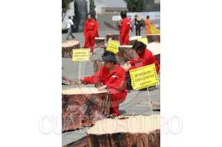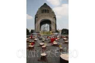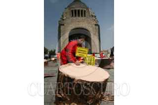 MÉXICO D.F., 09JULIO2009.- Colocando 80 tacones de árboles en la explana del Monumento a la Revolución, integrantes de Green Peace, se manifestaron por la perdida de bosques y selvas lo cual significa perdida de masa forestal en México, esto dentro del marco del “Día del Árbol”. FOTO: GUILLERMO PEREA/CUARTOSCURO.COM