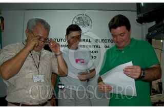 ACAPULCO, GUERRERO, 09JULIO2009.- Enrique Moreno, representante de IFE y Alejandro Carabias Icaza del partido Verde ganador a diputado federal por el Distrito IV en la pasada Jornada electoral, recibiendo la constancia de mayoria a en presencia de representantes de partidos politicos. FOTO: MARINO D. VALDEZ/CUARTOSCURO.COM