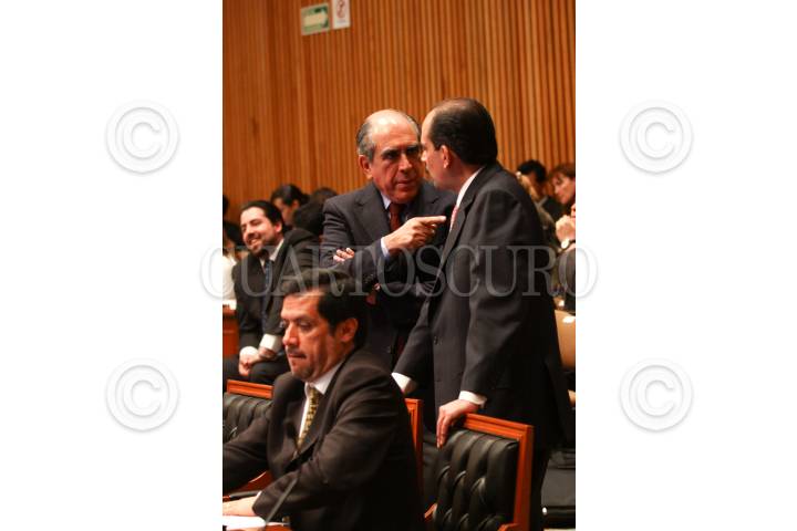 MÉXICO, D.F., 10JULIO2009.- Pablo Gomez senador del sol azteca, conversa con el consejero representante del PRI, Sebastián Lerdo de Tejada, durante la sesion extraordinaria del Consejo General del Instituto Federal Electoral FOTO: SÁSHENKA GUTIÉRREZ/CUARTOSCURO.COM