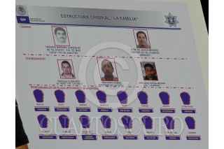 MÉXICO D.F., 11JULIO2009.- Aspectos del un cartel en donde se muestra la estructura criminal "La Familia" durante la presentación de Arnoldo Rueda Medina, alias "La Minsa" coordinador operativo de la organización criminal conocida como "La Familia Michoacana", y responsable de las operaciones de acopio, trasiego y venta de droga, que fue presentado en el Centro de Alto Mando de la Policía Federal en Iztapalapa después de ser capturado en Morelia, Michoacán. FOTO: RODOLFO ANGULO/CUARTOSCURO.COM