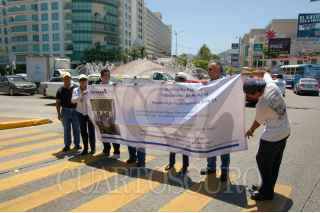 ACAPULCO, GUERRERO, 15JULIO2009.- Veinte trabajadores de la empresa aérea Aviacsa, realizaron una protesta frente a la Diana Cazadora y otro grupo a pocos metros de la Octava Región Naval Militar de la costera Miguel Alemán de Acapulco, esto en contra de directivos de la Secretaria de Comunicaciones y Transportes (SCT), quienes cierran sus fuentes de trabajo temporalmente con el argumento de revisar los aviones estacionados en el hangar del Aeropuerto Juan Álvarez perjudicando a 19 representantes de familias que trabajaban cotidianamente en esa empresa dijo el representante del movimiento Pedro Torres Saribario. FOTO: MARINO D. VALDEZ/CUARTOSCURO.COM