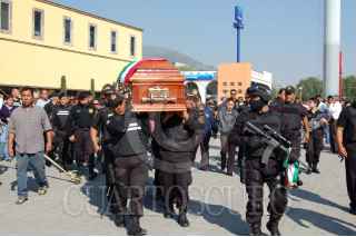 ECATEPEC, ESTADO DE MÉXICO 17JULIO2009.- Este viernes policías municipales dieron el último adiós a su compañero, Rafael Díaz Arroyo, quien tenía siete años en la corporación y en cuatro ocasiones fue reconocido por el Ayuntamiento por tener el mayor número de detenciones entre los mandos. Díaz Arroyo se enfrentó a disparos con un delincuente que asaltó una combi que se dirigía a Indios Verdes con 12 pasajeros, a la altura de Santa María Tulpetlac; el sujeto sacó una pistola y durante un forcejeo tanto el ladrón como el jefe policiaco murieron. FOTO: MARIO NULO/CUARTOSCURO.COM