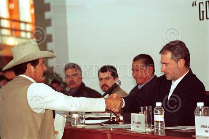 Campesinos de la Unión Nacional de Trabajadores Agricultores (U.N.T.A) se manifestarón durante la participación del secretario de Gobernación, Santiago Creel, en las mesas de diálogo a favor del campo, realizadas en el Archivo General de la Nación. FOTO: Eunice Adorno/CUARTOSCURO.COM