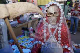 TULA DE ALLENDE, HIDALGO, 23JULIO2009.- Imagen de la santa muerte en un negocio de esta ciudad. Esta imagen es visitada por gente del norte del país, quienes acuden a ella para vestirla y hacerle petitiones. El culto a esta efigie en la zona va en aumento, aunque los adoradores son muy herméticos pues dicen que las corporaciones policiacas relación su veneración al crimen organizado, en especial al narcotráfico. FOTO: FRANCISCO VILLEDA/CUARTOSCURO.COM