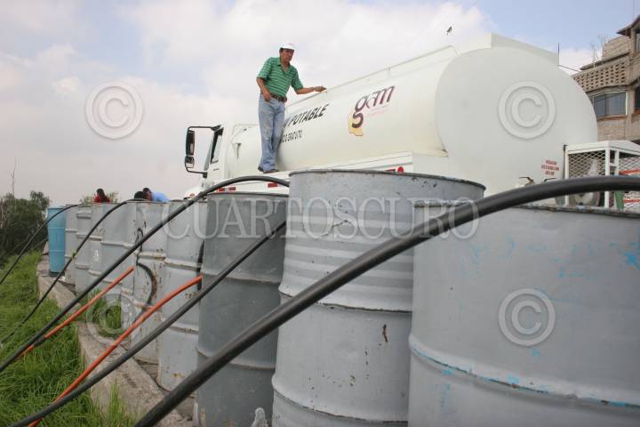 MÉXICO, D.F., 23JULIO2009.- Piperos llenan 2 veces por semana los tambos de vecinos de la colonia conocida como el mirador de la delegación Gustavo A. Madero donde por mas de 20 años han sufrido la falta de agua a pesar de que ya cuentan con la tubería y el drenaje necesario para surtir el liquido, estos piperos solo surte 4 tambos por familia, desde muy temprano llegan a las calles donde los colonos forman sus tambos para la repartición de agua FOTO: RICARDO CASTELAN/CUARTOSCURO.COM