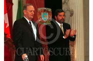 Juan Ramón de la Fuente, rector de la Universidad Nacional Autónoma de México, entregó un reonocimiento a Jean Chretien, primer ministro de Canadá, en una pequeña ceremonia realizada en el Antiguo Palacio de Minería de la capital. FOTO: Oswaldo Ramírez/CUARTOSCURO.COM