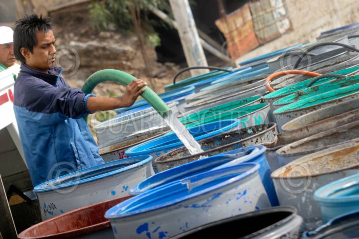 MÉXICO, D.F., 23JULIO2009.- Piperos llenan 2 veces por semana los tambos de vecinos de la colonia conocida como el mirador de la delegación Gustavo A. Madero donde por mas de 20 años han sufrido la falta de agua a pesar de que ya cuentan con la tubería y el drenaje necesario para surtir el liquido, estos piperos solo surte 4 tambos por familia, desde muy temprano llegan a las calles donde los colonos forman sus tambos para la repartición de agua FOTO: RICARDO CASTELAN/CUARTOSCURO.COM