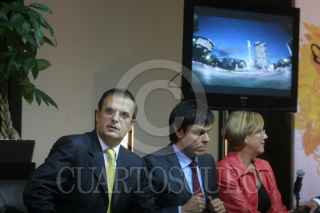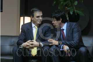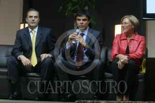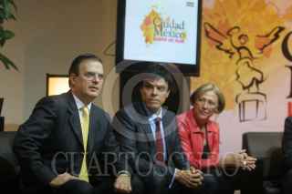 MÉXICO, D.F., 24JULIO2009.- Marcelo Ebrard jefe de gobierno del Distrito Federal, Jessie Cervantes, director de Exa FM, durante el anuncio del mega concierto que se realizara en el Ángel de la Independencia con el propósito de seguir promoviendo a la Ciudad de México como el primer destino turístico el país, este megaconcierto se realizara el próximo domingo 2 de agosto con la presencia de 12 artistas nacionales e internacionales. FOTO: RICARDO CASTELAN/CUARTOSCURO.COM