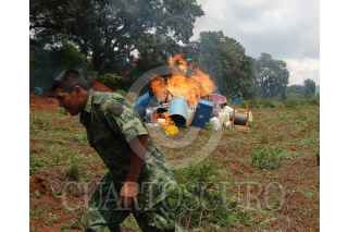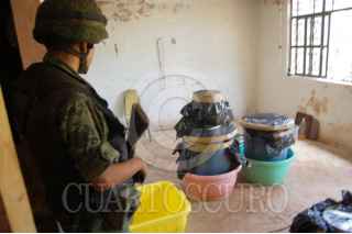 EL VAQUERITO MPO. CHARRO, MICHOACAN 26JULIO.- Fue desmantelado un "narcolaboratorio" que servía para fabricar droga sintetica conocida como "Crystal", en el lugar se encontraron diversos precursores químicos, como sosa caustica, thiner y diferentes sustancias desconodidas en la comunidad de El Vaquerito perteneciente al municipio de Charo Michoacán. FOTO: CUARTOSCURO.COM