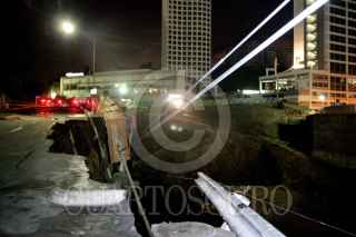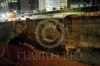 MÉXICO, D.F., 27JULIO2009.- La noche del domingo se registro un deslave de tierra con mas de 40 metros de profundidad dentro de la excavación para la construcción de un edificio en la zona de Santa Fe, los carriles laterales de la autopista México-Toluca se desmoronaron y obligo al cierre de la vialidad. FOTO: LUZ ACEVEDO/CUARTOSCURO.COM