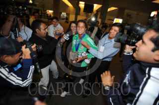 MÉXICO. D.F., 27JULIO2008.- Guillermo Ochoa, seleccionado nacional, a su llegada al Aeropuero Internacional de la Ciudad de México, despues de haber conseguido el triunfo ante su similar de los Estados Unidos, por un marcador de 5-0 quedando como campeones de la Copa de Oro 2009. FOTO: LUZ ACEVEDO/CUARTOSCURO.COM