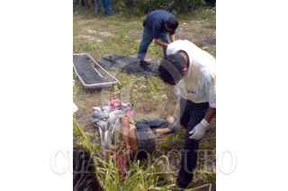 CANCÚN, QUINTANA ROO, 28JULIO2009.- Un cuerpo fue encontrado, en la parte continental de Isla mujeres, en un área verde de la colonia Victoria, el cadáver presentaba huellas de tortura, encadenado y con cinta en la cabeza y mutilación del dedo meñique, fue trasladado al servicio medico forense para las investigaciones correspondientes. FOTO: AMARANTA PRIETO/CUARTOSCURO.COM
