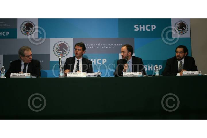 MÉXICO D.F., 31JULIO2009.- Miguel Messmacher Linartas, titular de la Unidad de Planeación Económica de la Hacienda Pública, acompañado de Juan Manuel Pérez Porrúa y Rodrigo Brand de Lara, durante la conferencia ofrecida ante los representantes de los medios de comunicación dio a conocer que ante la disminución de los ingresos públicos, la SHCP, prevé la reducción gradual de algunos subsidios para el próximo año. FOTO: GUILLERMO PEREA/CUARTOSCURO.COM