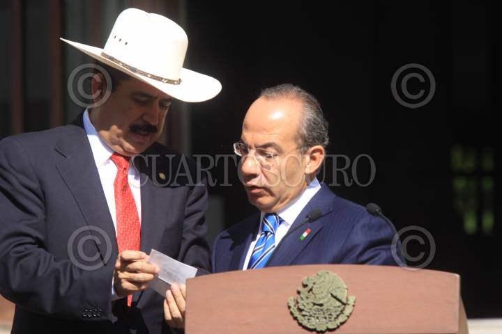 MÉXICO, D.F., 04AGOSTO2009.- El presidente de Honduras, Manuel Zelaya camina con el mandatario mexicano Felipe Calderón al termino de la conferncia ofrecida por ambos en la residencia oficial de los pinos FOTO: SÁSHENKA GUTIERREZ/CUARTOSCURO.COM