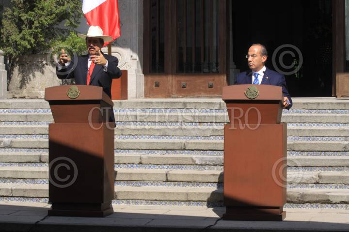 MÉXICO, D.F., 04AGOSTO2009.- El presidente de Honduras, Manuel Zelaya camina con el mandatario mexicano Felipe Calderón al termino de la conferncia ofrecida por ambos en la residencia oficial de los pinos FOTO: SÁSHENKA GUTIERREZ/CUARTOSCURO.COM