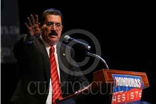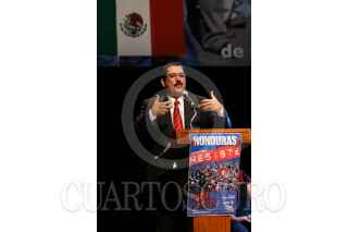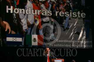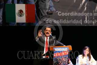 MÉXICO D.F., 05AGOSTO2009.- José Manuel Zelaya, Presidente depuesto de Honduras, invitado por la Senadora del PRD Yeidkol Polevnsky, acudió esta mañana a un encuentro con simpatizantes y gente que le apoya para su regreso a su país par el termino de su mandato, esto en el Teatro del Pueblo. FOTO: GUILLERMO PEREA /CUARTOSCURO.COM