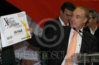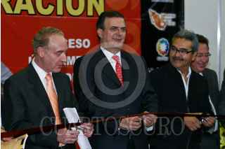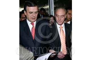 MÉXICO, D.F., 06AGOSTO2009.- Marcelo Ebrard, jefe de gobierno del D.F. y Benito Mirón Lince secretario del Trabajo y Fomento al Empleo del D.F.; observan un curriculum que una persona les dio durante el acto inaugural de la XX Feria del Empleo de la Ciudad de México que se realiza en el Palacio de los Deportes. FOTO: RODOLFO ANGULO/CUARTOSCURO.COM