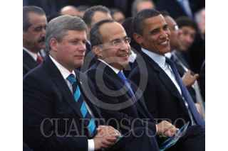 GUADALAJARA, JALISCO, 09AGOSTO2009.- El Presidente de los Estados Unidos Mexicanos, Felipe Calderon Hinojosa, acompañado del primer ministro de Canada, Stephen Harper, y Barack Obama, presidente de los estados unidos de America, durante un espectaculo que les ofrecieron en el maro de la Cumbre de lideres de America del norte. FOTO ALFREDO GUERRERO/CUARTOSCURO.COM