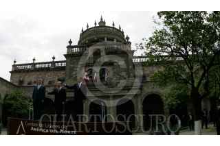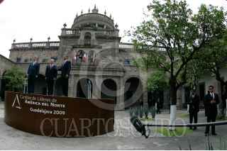 GUADALAJARA, JALISCO 10AGOSTO2009.- Stephen Harper, primer ministro de Canadá, Felipe Calderón presidente de México, y su similar de Estados Unidos, Barack Obama, posan para la toma de la fotografía oficial en el Instituto Cultural Cabañas. FOTO: SÁSHENKA GUTIERREZ/CUARTOSCURO.COM