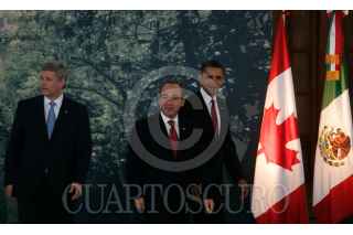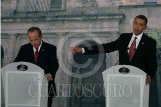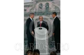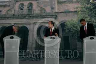 GUADALAJARA, JALISCO 10AGOSTO2009.- Stephen Harper, primer ministro de Canadá, Felipe Calderón presidente de México, y su similar de Estados Unidos, Barack Obama, al termino de la reunión trilateral en el Instituto Cultural Cabañas. FOTO: SÁSHENKA GUTIERREZ/CUARTOSCURO.COM