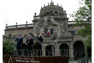GUADALAJARA, JALISCO 10AGOSTO2009.- Stephen Harper, primer ministro de Canadá, Felipe Calderón presidente de México, y su similar de Estados Unidos, Barack Obama, posan para la toma de la fotografía oficial en el Instituto Cultural Cabañas. FOTO: SÁSHENKA GUTIERREZ/CUARTOSCURO.COM