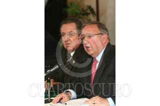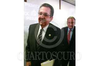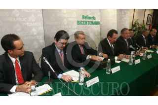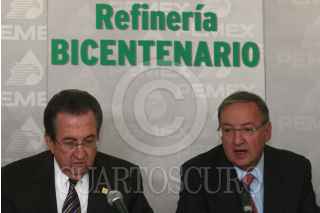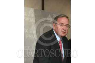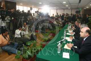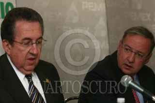 MÉXICO, D.F., 12AGOSTO2009.- Jesús Reyes Heroles, director de Pemex, acompañado del Secretario de la Reforma Agraria, Abelardo Escobar, ofrecieron una conferencia donde informaron que Tula será la sede de la nueva refinería, debido a que Hidalgo concluyó el proceso para que las tierras sean propiedad privada. FOTO: SAÚL LÓPEZ/CUARTOSCURO.COM