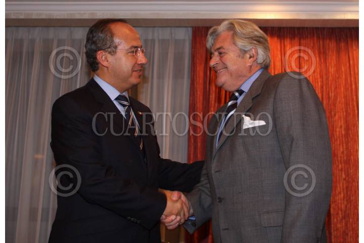 MONTEVIDEO, URUGUAY, 14AGOSTO2009.- Felipe Calderón Hinojosa, Presidente de México, durante una reunión que sostuvo con el candidato a la presidencia de la República de este país, Pedro Bordaberri, representante del Partido Colorado. FOTO: ALFREDO GUERRERO/CUARTOSCURO.COM